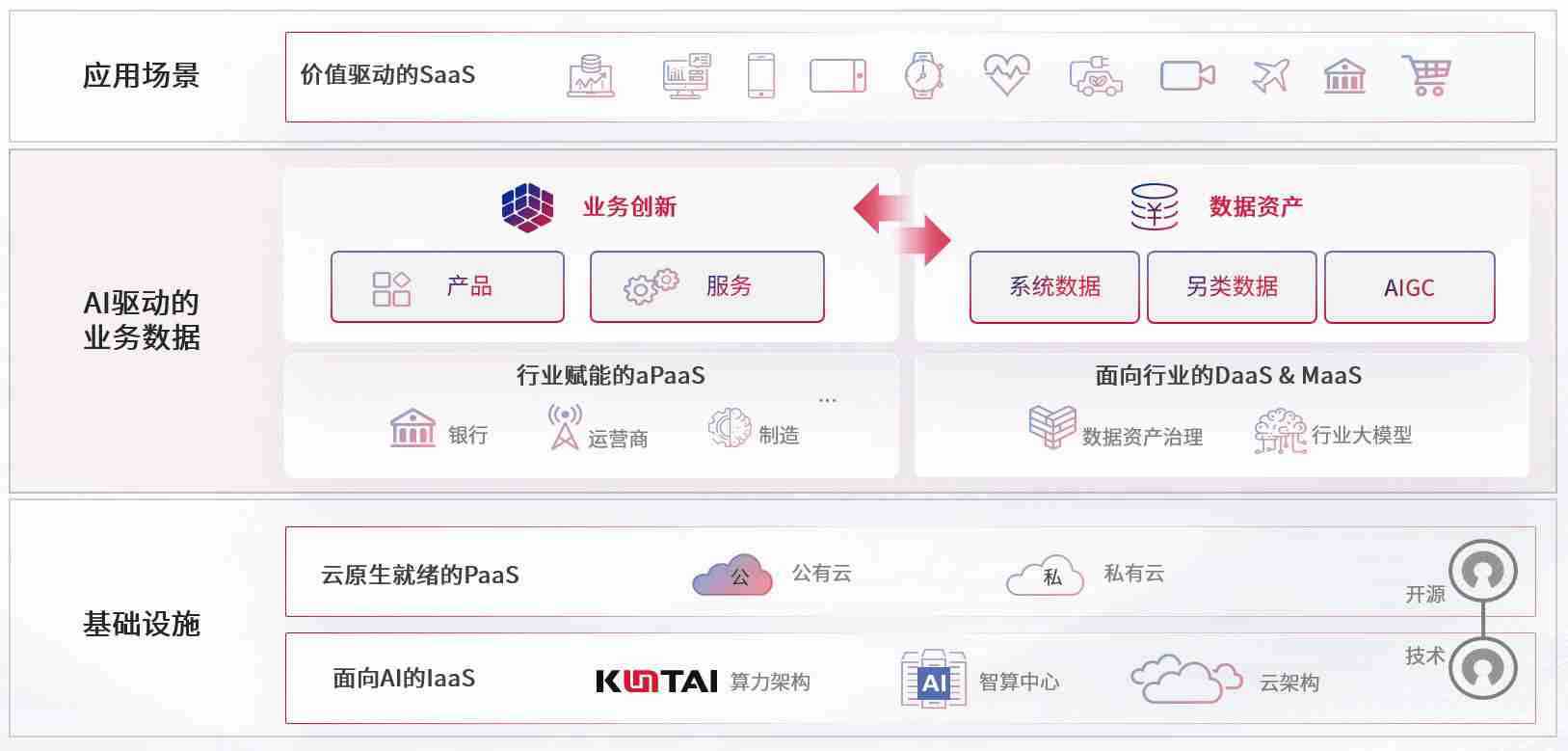 数字时代,,,围绕企业数字化转型的关键要素,,,,AG尊龙凯时数码开创性的提出数云融合战略和技术体系框架,,着力在云原生、、、数字原生、、AI原生和信创产业上架构产品和服务能力,,,,为处在不同数字化转型阶段的快消零售、、、汽车、、、金融、、、、医疗、、、、政企、、、、教育、、运营商等行业客户提供泛在的敏捷IT能力和融合的数据驱动能力,,,,构建跨界融合创新的数字业务场景和新业务模式,,,助力企业级客户建立面向未来的核心能力和竞争优势,,,,全面推动社会的数字化、、、智能化转型升级。。