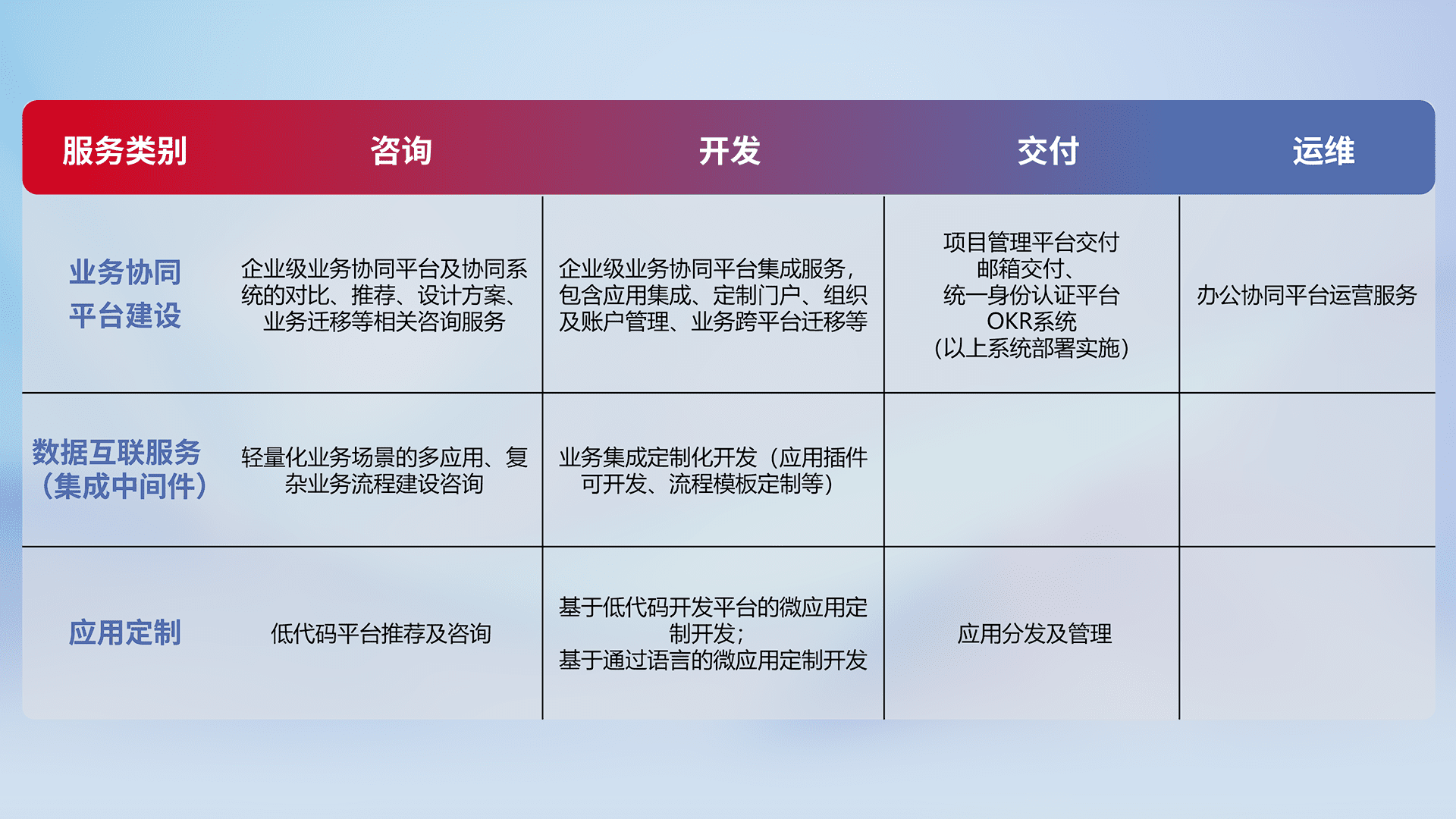 针对钉钉、、、、企微、、IDaas等平台级产品提供产品的规划、、、方案、、、、交付、、定制化开发等服务,,实现如统一协同办公、、、智能客户服务、、、混合会议管理、、、智能数据查询、、、等业务场景,,,实现数字化转型。。